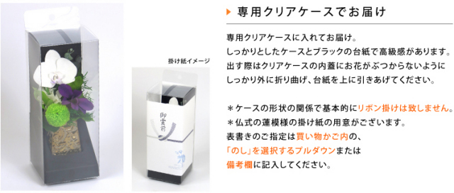 TOPイメージで選ぶ 和風・和モダン|Japanese Modern プリザーブドフラワー 如月(きさらぎ) 価格: ¥9,900 (税込) ~ ¥19,800 (税込) [ポイント還元 99ポイント〜] 販売期間: メッセージカード: 選択してください カード不要(¥0) 【無印字】お客様手書き用カード/送付先別の場合添付不可(¥0) 【自由文印字】カード→カート内備考欄へ内容指定(¥0) 【定型文】母の日用定型文(¥0) 【定型文】ありがとう(¥0) 【定型文】ありがとうございます(¥0) 【定型文】日頃の感謝の気持ちを込めて(¥0) 【定型文】お誕生日おめでとうございます(¥0) 【定型文】ご開業おめでとうございます(¥0) 【定型文】ご開店おめでとうございます(¥0) 【定型文】ご結婚おめでとうございます(¥0) 【定型文】おめでとうございます(¥0) 【定型文】お世話になりました(¥0) 【定型文】お疲れ様でした(¥0) 【定型文】これからもよろしくお願いします(¥0) 【定型文】いつまでもお元気でいてくださいね(¥0) 【定型文】お見舞い申し上げます(¥0) 【定型文】お悔やみ申し上げます(¥0) 【定型文】Thank You!(¥0) 【定型文】Happy Birthday(¥0) 【定型文】Happy Wedding(¥0) 【定型文】Especially for You(¥0) 【定型文】Congratulations!(¥0) 【定型文】クリスマス用定型文(¥0) 【定型文】父の日用定型文(¥0) 【定型文】敬老の日用定型文(¥0) 【定型文】フラワーバレンタイン用定型文(¥0) 【定型文】ホワイトデー用定型文(¥0) 【箔】Thank You ありがとうございます(¥330) 【箔】Happy Birthday お誕生日おめでとうございます(¥330) 【箔】Congratulations おめでとうございます(¥330) 【箔】Happy Wedding ご結婚おめでとうございます(¥330) 【箔】Especially for You 特別なあなたへ(¥330) ブランドバック: 選択してください 【袋】不要(¥0) 【袋】購入品ひとつが入るサイズの袋1枚(¥330) 【袋】購入品全てが入るサイズの袋1枚(¥330) 【袋】予備の袋希望(1商品につき2枚)(¥660) リボンorのし紙: 選択してください 【リボン】おまかせ(¥0) 【リボン】A茶細(¥0) 【リボン】Bロゴ(¥0) 【リボン】C金ラメ(¥0) 【リボン】D金サテン(¥0) 【リボン】Eグレー(¥0) 【リボン】リボン不要(¥0) 【のし】御祝(花結び) ※結婚祝と快気祝以外の用途(¥0) 【のし】寿(結婚祝い、引き出物等)(¥0) 【のし】祝 御開業(開業祝い)(¥0) 【のし】祝 御開店(開店祝い)(¥0) 【のし】祝 御新築(新築祝い)(¥0) 【のし】祝 御竣工(大型施設/ビル等の新築祝い)(¥0) 【のし】祝 ご出産(出産祝い)(¥0) 【のし】祝 ご入学(入学祝い)(¥0) 【のし】祝 ご卒業(卒業祝い)(¥0) 【のし】祝 ご成人(成人式のお祝い)(¥0) 【のし】祝 ○婚式/結婚何年目かをご記入ください(¥0) 【のし】御年賀(新年のご挨拶)(¥0) 【のし】御中元(夏のご挨拶)(¥0) 【のし】御歳暮(年の瀬、一年のご挨拶)(¥0) 【のし】快気祝(お見舞いへの返礼)(¥0) 【のし】(結婚)内祝 (結婚祝いの返礼)(¥0) 【のし】(出産)内祝/お子様の名前・かな要記入(¥0) 【のし】内祝(花結び) ※結婚・出産以外の用途(¥0) 【のし】祝 御改築(改築祝い)(¥0) 【のし】無印字のし(表書き無し)【花結び】(¥0) 【のし】無印字のし(表書き無し)【10本結び切】(¥0) 【のし】無印字のし(表書き無し)【5本結び切り】(¥0) 【のし】無印字のし(表書き無し)【仏式弔事用】(¥0) 【のし】御供(仏式)(¥0) 【のし】御霊前(仏式 49日前日まで)(¥0) 【のし】御仏前(仏式 49日以降)(¥0) 【のし】志(仏式の返礼)(¥0) 【のし】その他の表書き→備考欄に記載(¥0) 包装紙: 選択してください 【包】不要(クリアケースor箱にリボンがけ)(¥0) 【包装紙】水色ベル・フルールロゴ(¥330) 【包装紙】ブラウン(¥330) 【包装】梨地バッグ(¥330) 数量: 個 デザイン単品/セット価格在庫購入胡蝶蘭単品(即日発送)¥9,900(税込)○ 一対(左右対称2点セット・納期3週間)¥19,800(税込)○ カーネーション単品(即日発送)¥9,900(税込)○ 一対(左右対称2点セット・納期3週間)¥19,800(税込)○ デザイン単品/セット価格在庫購入胡蝶蘭単品(即日発送)¥9,900(税込)○ 一対(左右対称2点セット・納期3週間)¥19,800(税込)○ カーネーション単品(即日発送)¥9,900(税込)○ 一対(左右対称2点セット・納期3週間)¥19,800(税込)○ 返品・交換について 4.2 (12件) ■「一対(左右対称2点セット)」は納期15営業日(土日を除く)でご注文可能です。 配送日時指定は【3週間後】以降から指定できます。 ギフト対応・サービス詳細 ◆この商品はクリアケース入りでお届けいたします。 ◆プリザーブドフラワーの取り扱い説明カード入り。 ※大きな文字の説明書をご希望の方は備考欄へご記入ください。 商品サイズ 幅9cm×奥行き7cm ×高さ19cm重さ:250g (参考値)クリアケースサイズ:如月専用(幅9cm×奥行き9cm×高さ23cm+3cm) 材質 ◆花材:すべてプリザーブドフラワー 「デンファレ」:デンファレソニア、ことね菊、ストーベ、アセビ、各種リーフ 「マム」:輪菊、小菊、ピンポンマム、ストーベ、アセビ、各種リーフ 「胡蝶蘭」:胡蝶蘭、デンファレ、ピンポンマム、アジサイ、各種リーフ 「カーネーション」:カーネーション、デンファレ、ことね菊、アジサイ、各種リーフ 