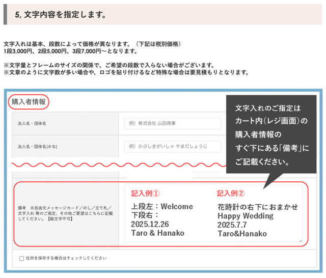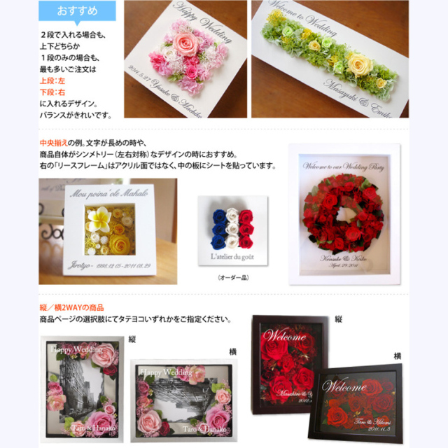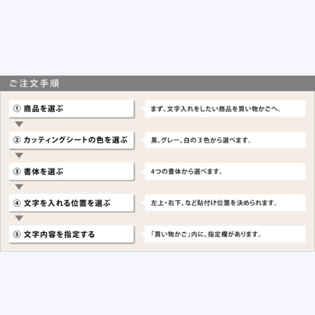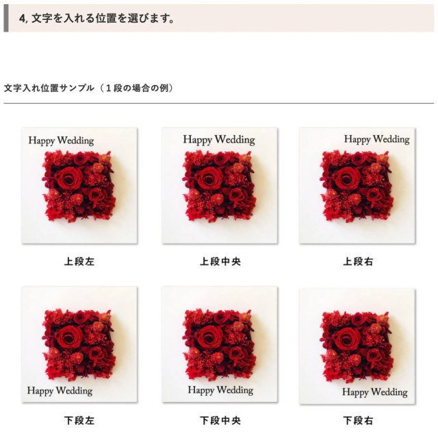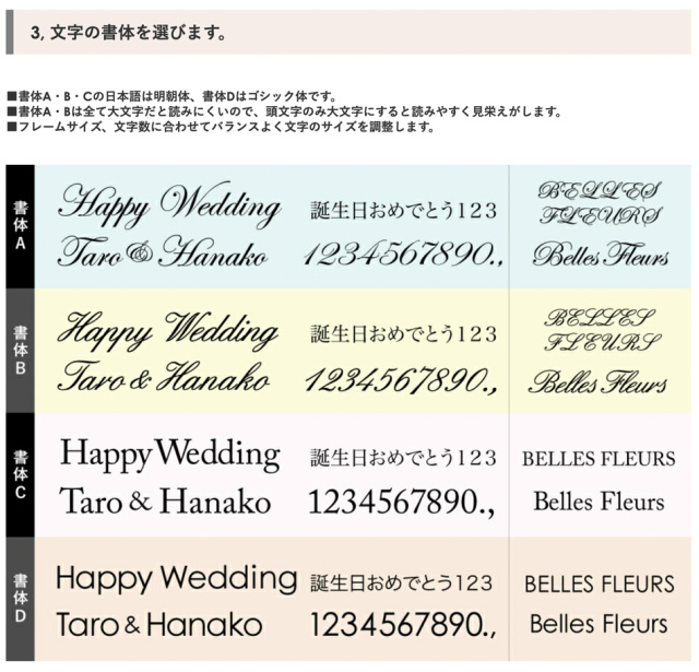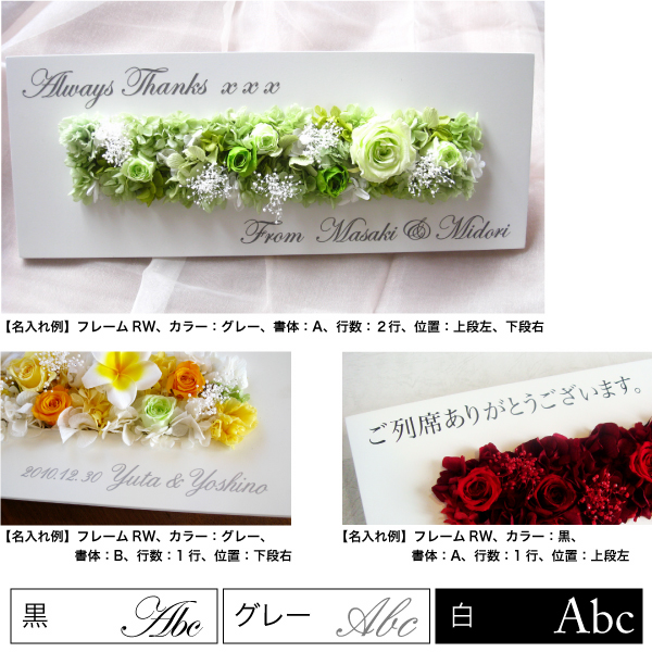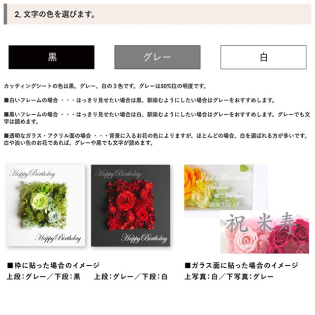 TOP名入れ・文字入れ カッティングシート 文字入れ 名入れ 指定 価格: ¥0 (税込) ~ ¥9,900 (税込) 販売期間: ■カッティングシートの色・書体: 選択してください 書体A・白 書体A・グレー 書体A・黒 書体B・白 書体B・グレー 書体B・黒 書体C・白 書体C・グレー 書体C・黒 書体D・白 書体D・グレー 書体D・黒 数量: 個 カッティングシートの段数価格在庫購入1段¥3,300(税込)○ 2段¥5,500(税込)○ 3段¥7,700(税込)○ 4段¥9,900(税込)○ その他(見積もり)¥0(税込)○ カッティングシートの段数価格在庫購入1段¥3,300(税込)○ 2段¥5,500(税込)○ 3段¥7,700(税込)○ 4段¥9,900(税込)○ その他(見積もり)¥0(税込)○ 返品・交換について 4.4 (9件) ◾️ゴールデンウィーク・お盆休暇・年末年始などの長期休暇期間中は、工場が休業となるため、通常よりも納期にお時間をいただいております(目安:2週間〜3週間)。 恐れ入りますが、予めご了承くださいますようお願い申し上げます。 ●カッティングシート作成は受注日より10〜14日間ほど製作期間を頂いております。 ※お急ぎの場合は事前にご連絡をお願いします。 事前確認希望の方は2週間以上余裕を持ってご注文くださいませ。 期限内にご返信がいただけない場合は、特急料金が追加となります。 ●システム上の配送日時指定よりお時間を頂く場合もございます。 ●文字数が多い場合は追加料金がかかる場合がございます。 ご注文確認メールを必ずご確認ください。 ●「備考欄」に上下段の文字位置の指定をお願いします。 ≪記載例:1段の場合≫ 上段左:Happy Wedding ≪記載例:2段の場合≫ 上段左:Happy Wedding 下段右:Taro & Hanako ≪記載例:3段の場合≫ 上段左:Happy Wedding 下段右: 2020.12.20 Taro & Hanako ●文字の大きさは、専門のグラフィックデザイナーがバランスを見て適宜調整いたします。 ●この商品は単品ではご購入いただけません。 ●何か特別なご希望、不明点がございましたら、備考欄にお書き添えください。 ※当店よりメールまたはお電話にて折り返しご連絡させていただく場合がございます。ご注文確認のメールを必ずご確認ください。 プリザーブドフラワーは、水やり等の手間なく長期間保つ事から、バースデーギフト(誕生日祝い)・結婚祝い・開業祝い・開店祝い・新築祝い・内祝い・出産祝い・両親贈呈ギフトなどの贈り物、法人様向けご進物にはもちろん、アート性の高い作品はご自宅用のインテリアやオフィス・ショップのディスプレイに、落ち着いた色や故人のお好きだった色や花はお供え・仏事にもご利用頂いております。ブリザードフラワー、ブリザーブドフラワーではなく「保存する」という意味の「プリザーブドフラワー/preserved flower」が正しい名称となります。直射日光、水気・湿気を避けるとより美しさが長持ちします。 カッティングシート文字入れサービス カッティングシートで世界にひとつだけのオリジナルデザインを! カッティングシートとは、裏側に接着用のりがついた非常に薄い塩化ビニールのシートです。切り抜いて文字やロゴに加工したものを貼付けます。細かい文字も切り口がシャープで美しいのが特徴。 フレーム系の商品など、「平らな面」がある商品にできる名入れ・文字入れ方法です。 文字内容や書体等をご指定頂くだけで、簡単にオーダーして頂けます。 当店専門のグラフィックデザイナーが、商品に最適なサイズ、レイアウトに調整して作成致します。 実店舗でも数多くの事例を承っており、“オンリーワン”のギフトとして大変喜ばれています。 ご注文の手順は5ステップ 1, 文字入れしたい商品を選びます。 2, 色を選びます。 3, 書体を選びます。 4, 位置を選びます。 5, 内容を指定します。 1, 商品を選びます。 基本的にはフレーム系の商品からお選びいただけます。 ※このページに紐づいている商品には入れることができます。 ※「フレームリース」は中の板面の余白にも入れられます。 「フレームの枠」への文字入れがおすすめの商品 フレームS ¥8,000(税別) ホワイトフレームS ¥8,000(税別) フレームRM ¥12,000(税別) フレームRW ¥18,000(税別) グリーンフレームシリーズ ¥12,000 〜(税別) 「ガラス(アクリル)面」への文字入れがおすすめの商品 プリフォトシリーズ ¥8,000 〜(税別) ジュエリーボックス ¥15,000(税別) 花時計スクエア ¥20,000(税別) 花時計フォトフレーム ¥20,000(税別) 丸型花時計 ¥25,000(税別) フレームロング〈45〉 ¥25,000(税別) フレーム2L ¥30,000(税別) フレームロング〈60〉 ¥30,000(税別) リースフレーム3L ¥45,000 (税別) フレーム3L ¥50,000(税別) 「枠」「ガラス面」どちらにも文字入れが可能な商品 フレームM ¥15,000(税別) プルメリアフレーム ¥15,000(税別) カバーフレーム ¥100,000 〜(税別) 2, 文字の色を選びます。 カッティングシートの色は黒、グレー、白の3色です。グレーは50%位の明度です。 ■白いフレームの場合 ・・・はっきり見せたい場合は黒、馴染むようにしたい場合はグレーをおすすめします。 ■黒いフレームの場合 ・・・はっきり見せたい場