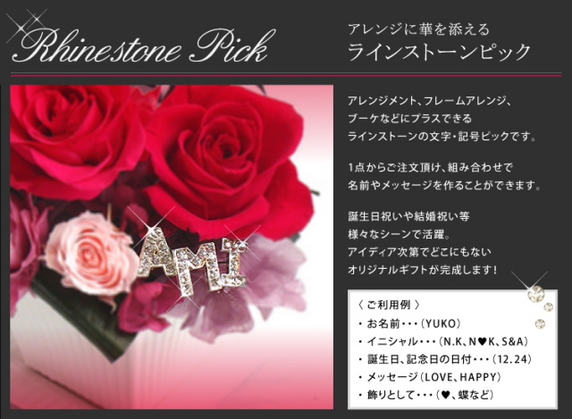TOP名入れ・文字入れ ラインストーン文字・記号ピック ラインストーンピックA→R 価格: ¥550 (税込) [ポイント還元 5ポイント〜] 販売期間: この商品のみでは購入できません。: 選択してください 確認済み 当店のお花と共に購入してください。: 選択してください 確認済み 数量: 個 文字在庫購入A○ B○ C○ D○ E○ F○ G○ H○ I○ J○ K○ L○ M○ N○ O× P○ Q○ R○ 文字在庫購入A○ B○ C○ D○ E○ F○ G○ H○ I○ J○ K○ L○ M○ N○ O× P○ Q○ R○ 返品・交換について 5.0 (3件) ◆アルファベットSからZ、記号はこちら ◆数字ピックはこちら スワロのキラキラ文字ピックで記念に残るオリジナルギフトに! 文字サイズ:縦横15mm前後×厚さ1.3cm ピリオド:直径4mm ーーご注文方法ーー ★アレンジメント等の商品と、この商品を一緒に買い物かごへ入れてください。 ↓ ★2点以上ご購入の場合は「備考欄」に文字の並び順をご指定ください。 ★位置のご希望がございましたら合わせてご記入ください。 ※特にご希望がない場合はデザイナーがバランスを見て「おまかせ」でお入れ致します。 ーー必ずお読みくださいーー ★この商品のみの購入は原則できません。 ★文字入れ商品のお客様都合による返品はお受けできません。 ★ラインストーンピックは、アレンジメント、フレームアレンジ、ブーケなどのお花の間に挿してご利用いただくものです。 ステム付きローズ1輪等には挿すことが出来ません。 上記について、予めご承知置きください。 プリザーブドフラワーは、水やり等の手間なく長期間保つ事から、バースデーギフト(誕生日祝い)・結婚祝い・開業祝い・開店祝い・新築祝い・内祝い・出産祝い・両親贈呈ギフトなどの贈り物、法人様向けご進物にはもちろん、アート性の高い作品はご自宅用のインテリアやオフィス・ショップのディスプレイに、落ち着いた色や故人のお好きだった色や花はお供え・仏事にもご利用頂いております。ブリザードフラワー、ブリザーブドフラワーではなく「保存する」という意味の「プリザーブドフラワー/preserved flower」が正しい名称となります。直射日光、水気・湿気を避けるとより美しさが長持ちします。 お客様の声 のぼさん様 投稿日:2022年10月11日 おすすめ度: フルネームだと長くなるので名前のイニシャル一文字にしましたがちょっとしたアクセントになってとても良い感じでした。 かえでっ様 投稿日:2021年12月04日 おすすめ度: ガラスドームにプラスでチョイスしました。 お名前、イニシャル、短めのメッセージであれば、 お花を邪魔せずにおしゃれになります。 たった1つの贈り物になるので、おすすめです。 MASAYO様 投稿日:2020年05月28日 おすすめ度: 赤いバラの小さなアレンジメントでしたが、ラインストーンのイニシャルを入れて頂いたことでグレードが一段アップして見栄えもよく、送った友人に大変喜んで頂けました。